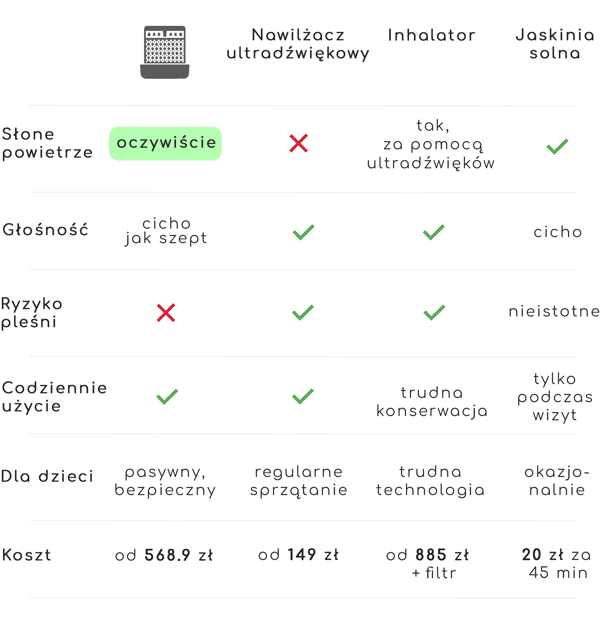 Idealna dla osób, które cenią powietrze jak nad morzem i chcą w naturalny sposób zadbać o łagodny, przyjemny mikroklimat w swoim domu – bez pary, hałasu i zbędnej wilgoci.